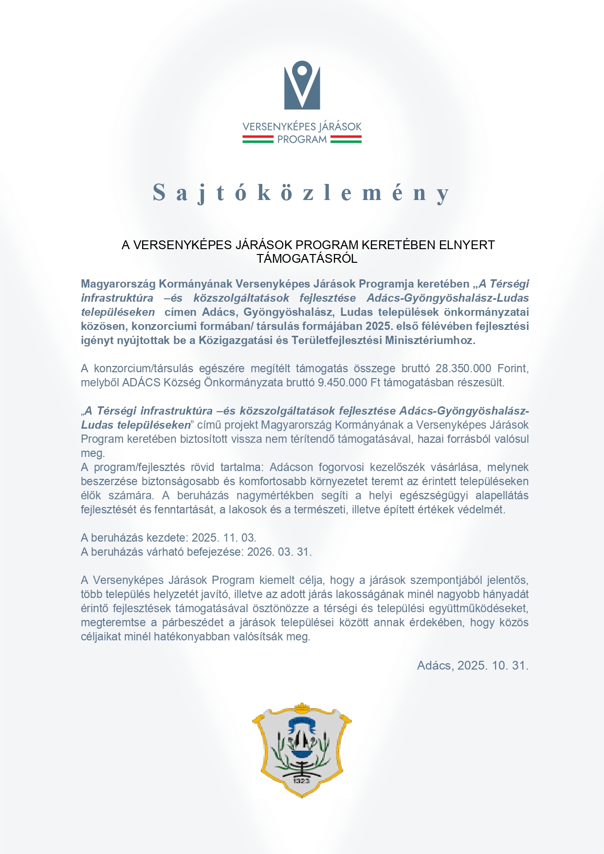 Folyamatban lévő pályázatok·Hírek·Pályázatok Sajtóközlemény – a versenyképes járások program keretében elnyert támogatásról 2025-11-19 Letölthető PDF formátumban Keresés HirdetményekVizsgálati eljárás lezárása (2025. július 9.) Közlemény az öntözésről (2025. ápr. 14.) Hagyatéki hirdetmény (Rais Mónika) ASP pályázat A projekt címe: „Adács Község Önkormányzata ASP központhoz való csatlakozása” Ehhez kapcsolódik Pályázat – temetői út fejlesztése Hirdetmény – APOLLO gumigyár 2025. június 2.